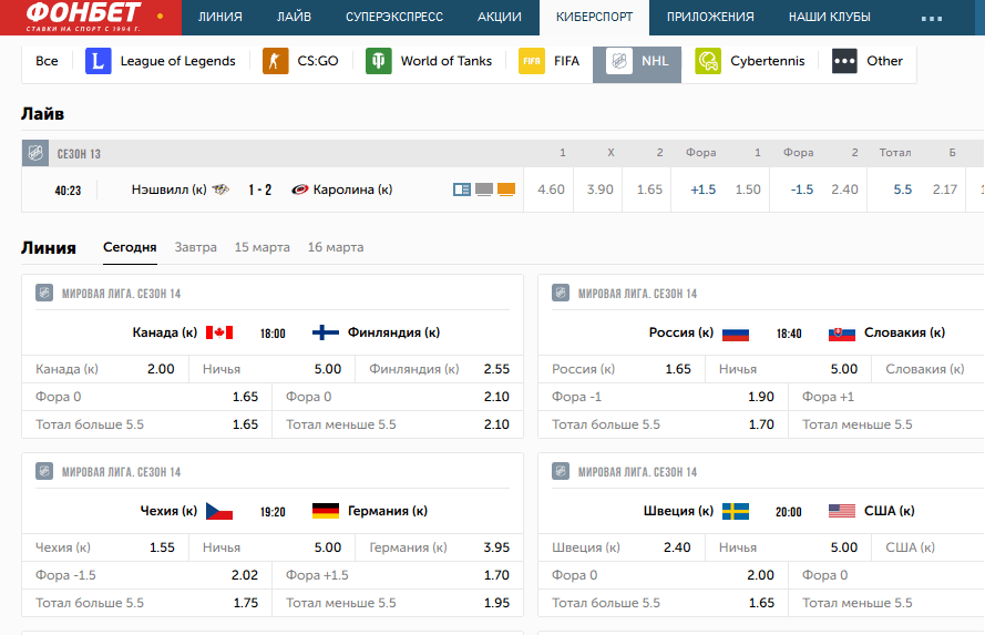 Ставки на киберхоккей, в отличие от киберфутбола, принимает не так много российских букмекеров. На сегодня такая линия всегда есть в БК «Фонбет» и периодически появляется в других конторах. Практически везде букмекер предлагает два типа ставок: